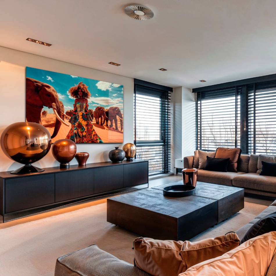 Muurkunst van een mooie Afrikaanse vrouw met olifanten in een woestijn. Kleurrijke wall art toont een modieuze beautiful woman in moderne fashion, geïnspireerd door de Afrikaanse cultuur. Deze beautiful woman met olifanten uit Afrika is kleurrijke kunst voor op de muur, ideaal voor een stijlvol interieur. Verkrijgbaar als onder andere akoestisch schilderij, Dibond wall art of plexiglas kunst van museumkwaliteit in bijna alle formaten, inclusief maatwerk. Bekijk ook de tweede variant van de African Woman with Elephants: African Woman with Elephants I&II