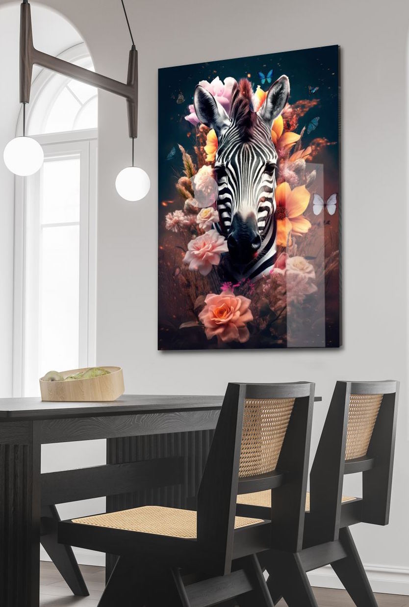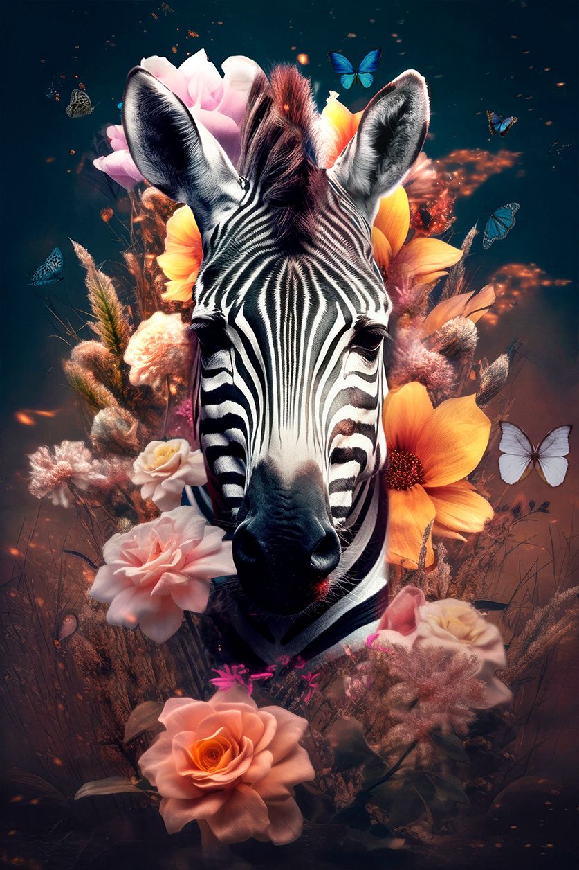 Bijzonder fotokunstwerk van een zebra. Dit leuke zebra-portret, met een fantastische en realistische kant, is verkrijgbaar bij ons op verschillende materialen, zoals geluidsabsorberend vilt, Dibond of plexiglas. Dit unieke dierenportret van de zebra, omringd door bloemen, is een fantasierijk fotokunstwerk met warme kleuren. Bekijk ook onze andere wall art van wilde dieren op onze website: